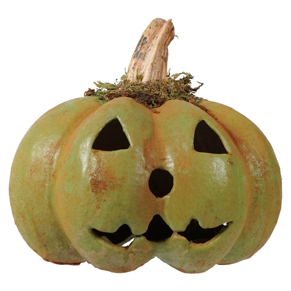 Who wants to carve a pumpkin in September? But with the Classic Green Pumpkin Jack-O’-Lantern, a delightful twist on the traditional Halloween icon you can display him for months with no fear of rot! This paper mache decoration, crafted by Raggedy Junction and made right here in America, brings a vintage vibe to your seasonal decor. Unlike the typical bright orange, this pumpkin sports a muted green hue, making it an understated yet striking addition to your autumn setup.