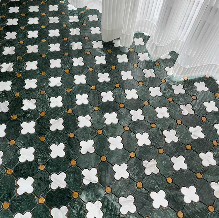 Give your lounge area or dining space a retro vibe with our clover leaf floor tiles. Featuring polished clover leaves against a deep jade green background, the motif will add a pop of liveliness to any living space.