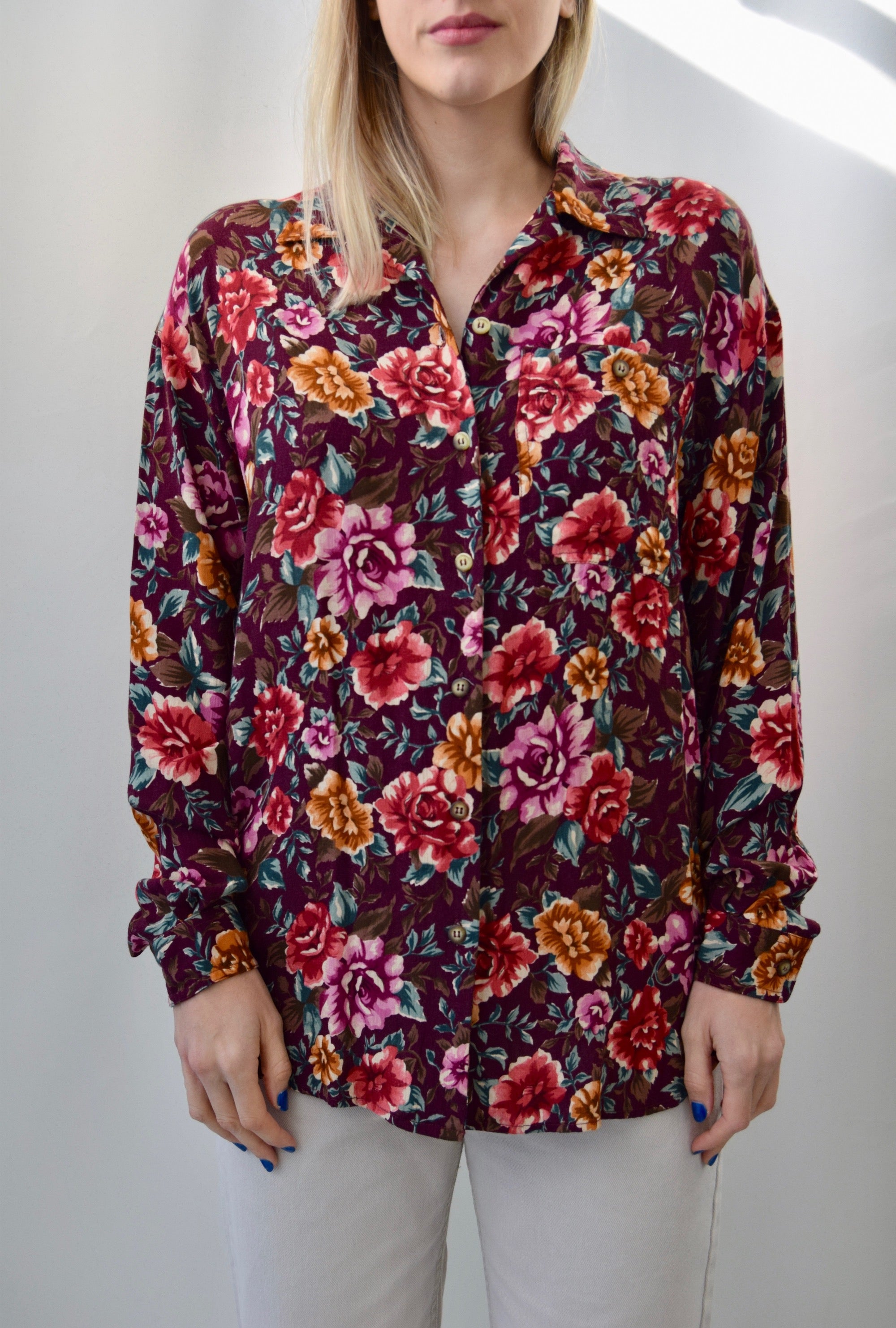 Long Sleeve Button Up Top With Loop Button Under Collar. Single Button Up Chest Pocket.